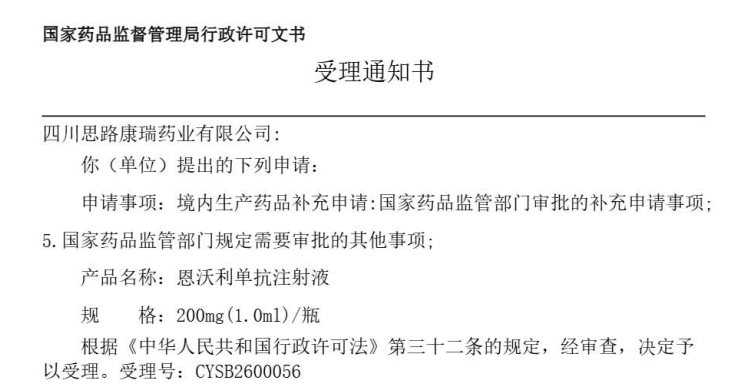 2026年2月,思路迪医药(1244.HK)宣布,旗下商业化产品恩维达®(通用名:恩沃利单抗注射液)由附条件批准转为常规批准的境内生产药品补充申请,正式获得国家药品监督管理局(NMPA)受理,受理号为CYSB2600056,申请规格为200mg(1.0ml)/瓶。这是恩维达®上市后的关键里程碑,标志着该产品的临床有效性、安全性进一步确证。思路迪医药长期深耕差异化适应症和未满足的临床需求,布局全球开发,I期在美国、日本和中国同步开展,是中国抗体药物最早在FDA拿到I期临床批件的biotech公司。